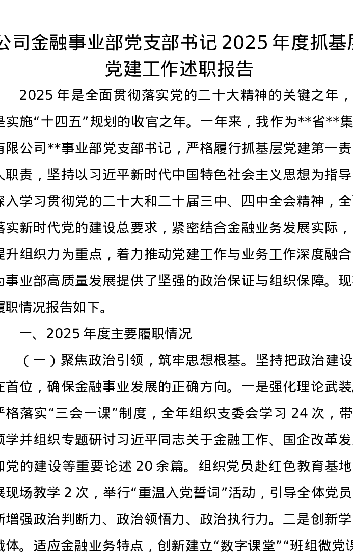 公司金融事业部党支部书记2025年度抓基层党建工作述职报告