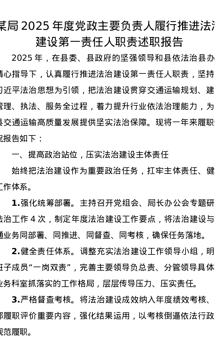 某局2025年度党政主要负责人履行推进法治建设第一责任人职责述职报告