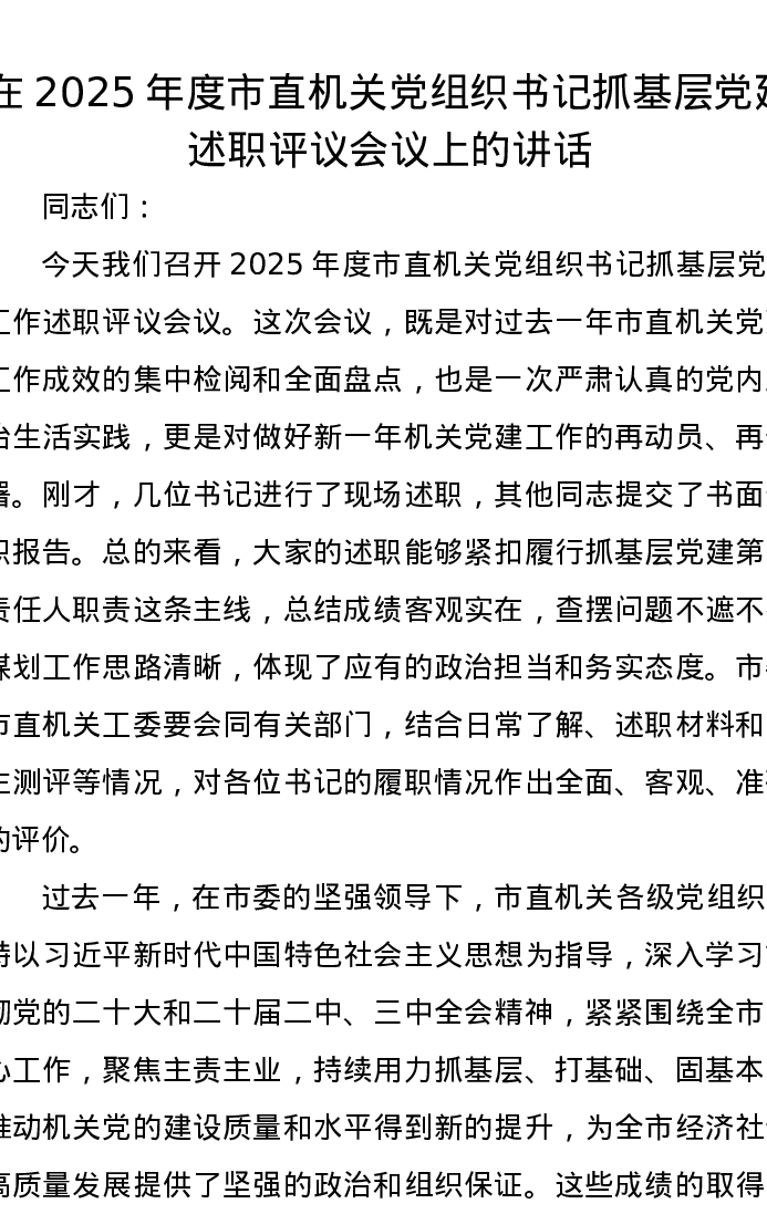 在2025年度市直机关党组织书记抓基层党建述职评议会议上的讲话