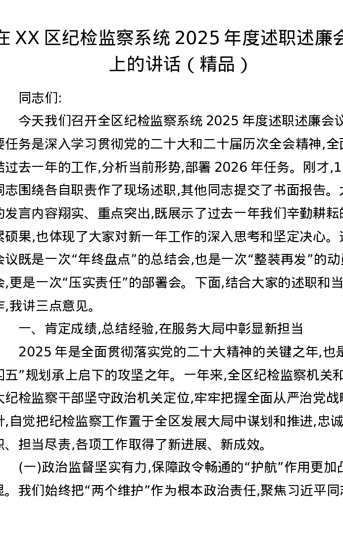 在XX区纪检监察系统2025年度述职述廉会议上的讲话