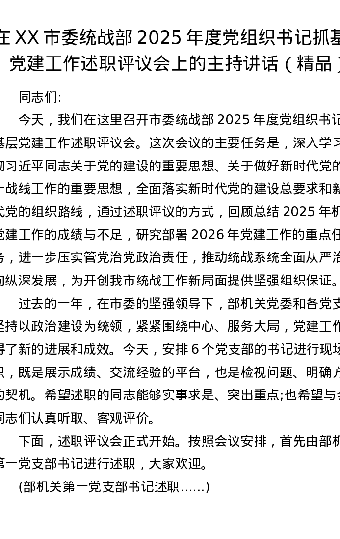 在XX市委统战部2025年度党组织书记抓基层党建工作述职评议会上的主持讲话