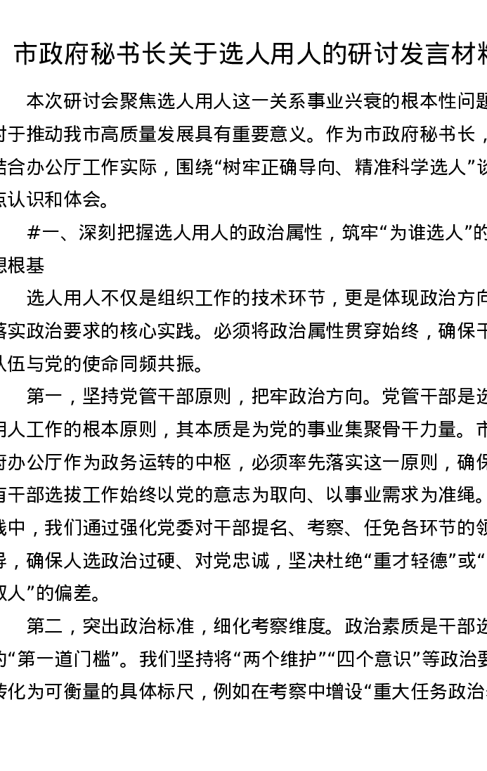 市政府秘书长关于选人用人的研讨发言材料(2219字)