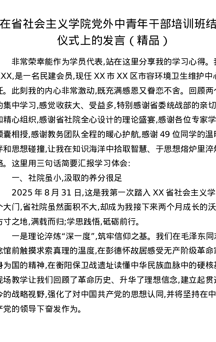 在省社会主义学院党外中青年干部培训班结业仪式上的发言