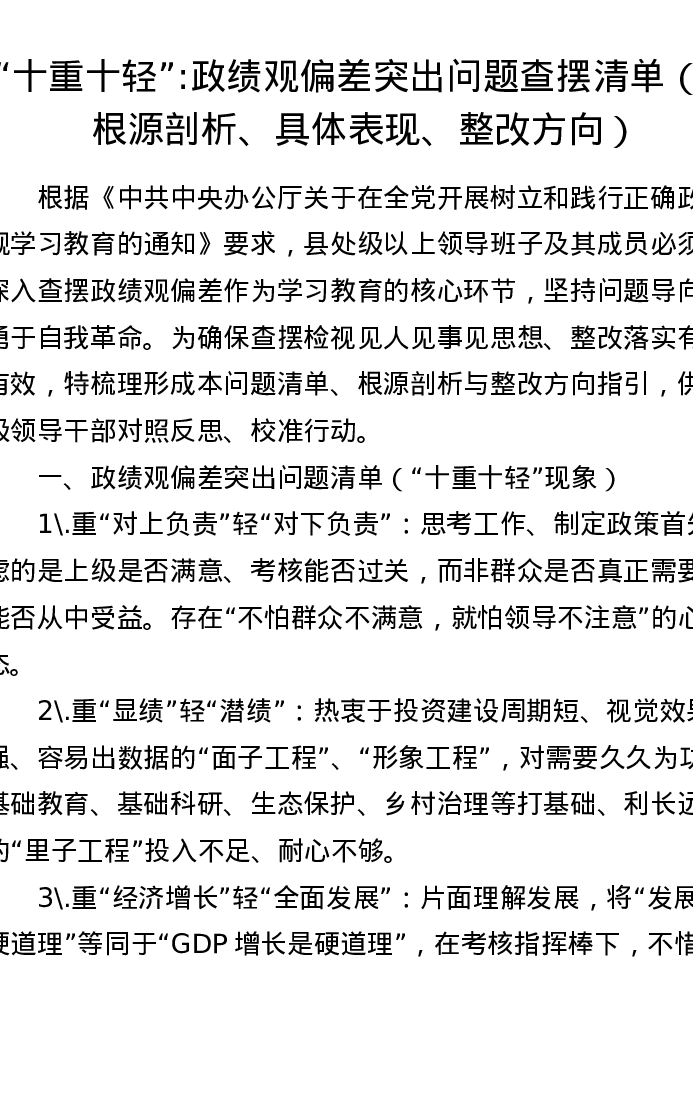十重十轻:政绩观偏差突出问题查摆清单(附根源剖析、具体表现、整改方向)