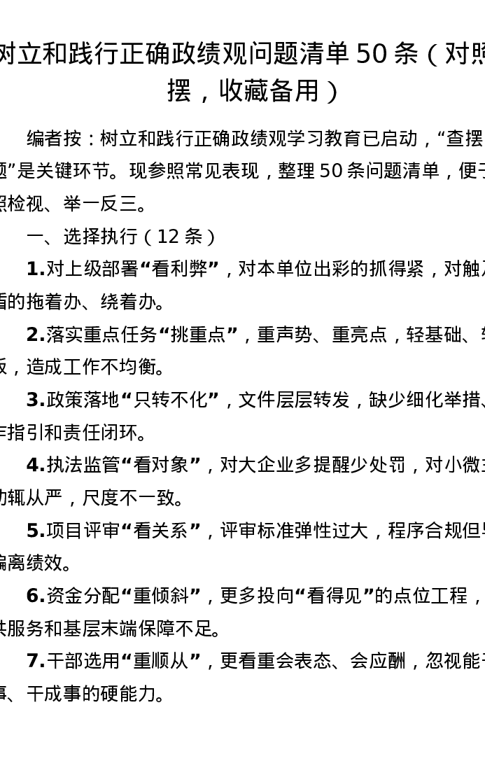 树立和践行正确政绩观问题清单50条