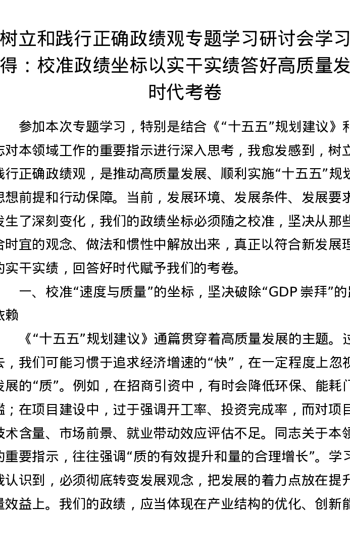 树立和践行正确政绩观专题学习研讨会学习心得:校准政绩坐标 以实干实绩答好高质量发展时代考卷