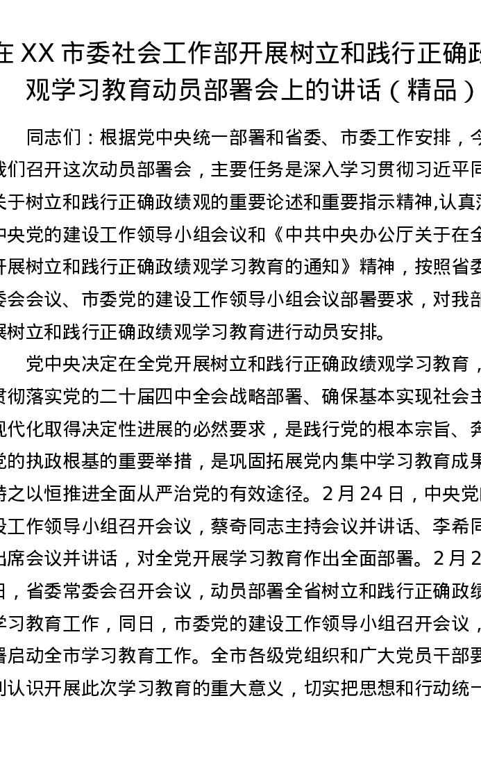 在XX 市委社会工作部开展树立和践行正确政绩观学习教育动员部署会上的讲话