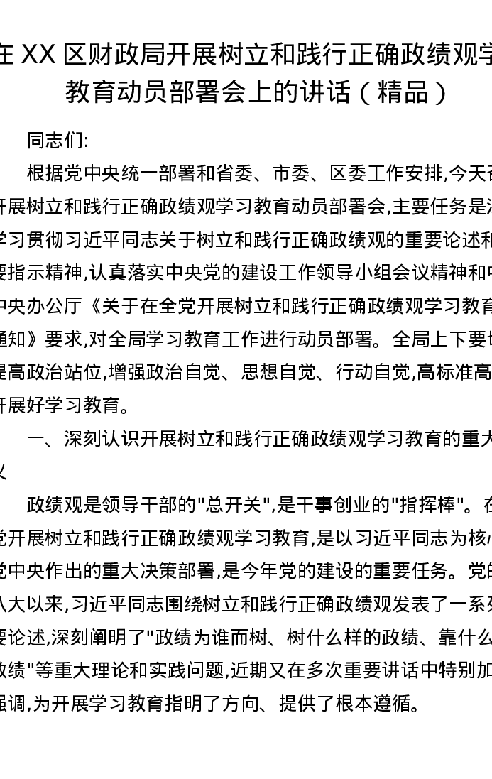 在XX区财政局开展树立和践行正确政绩观学习教育动员部署会上的讲话