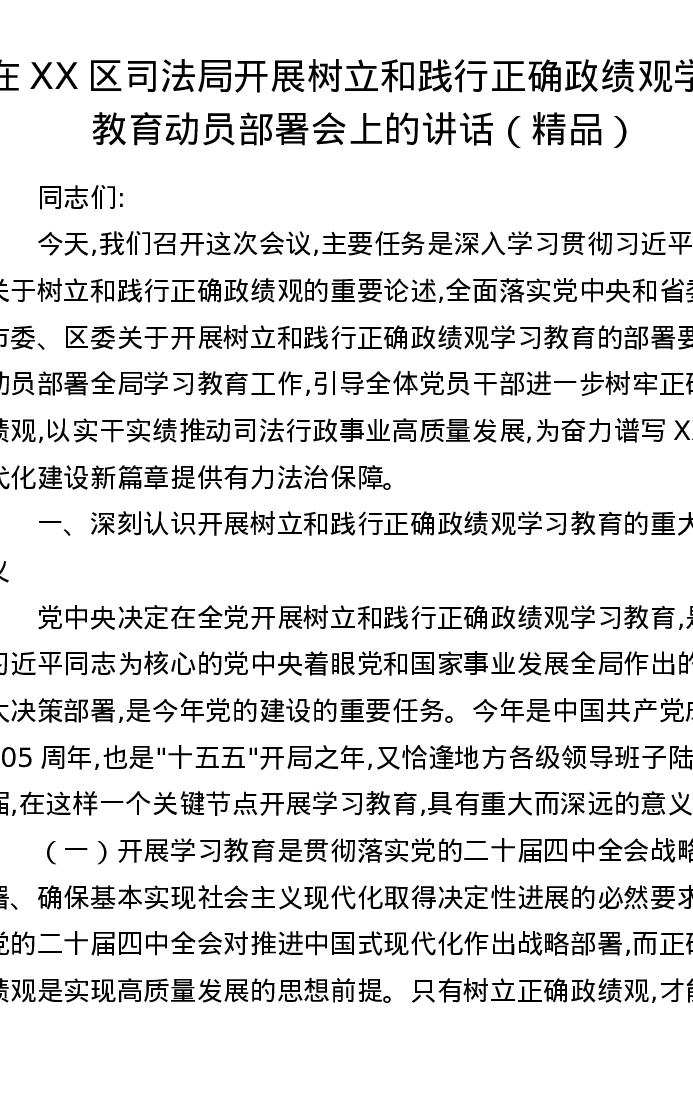 在XX区司法局开展树立和践行正确政绩观学习教育动员部署会上的讲话
