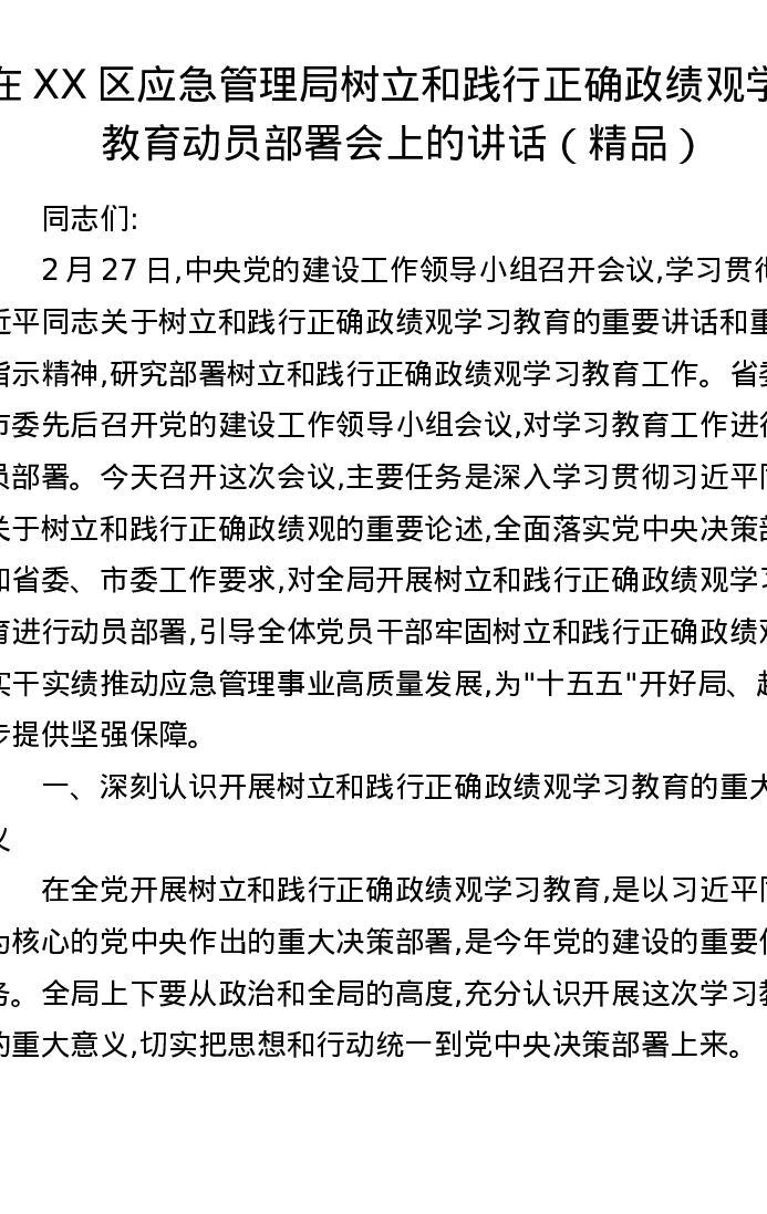 在XX区应急管理局树立和践行正确政绩观学习教育动员部署会上的讲话