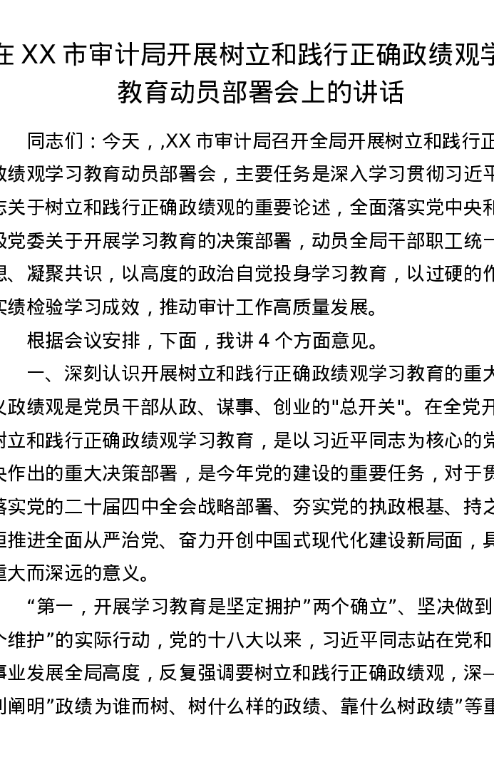 在XX市审计局开展树立和践行正确政绩观学习教育动员部署会上的讲话