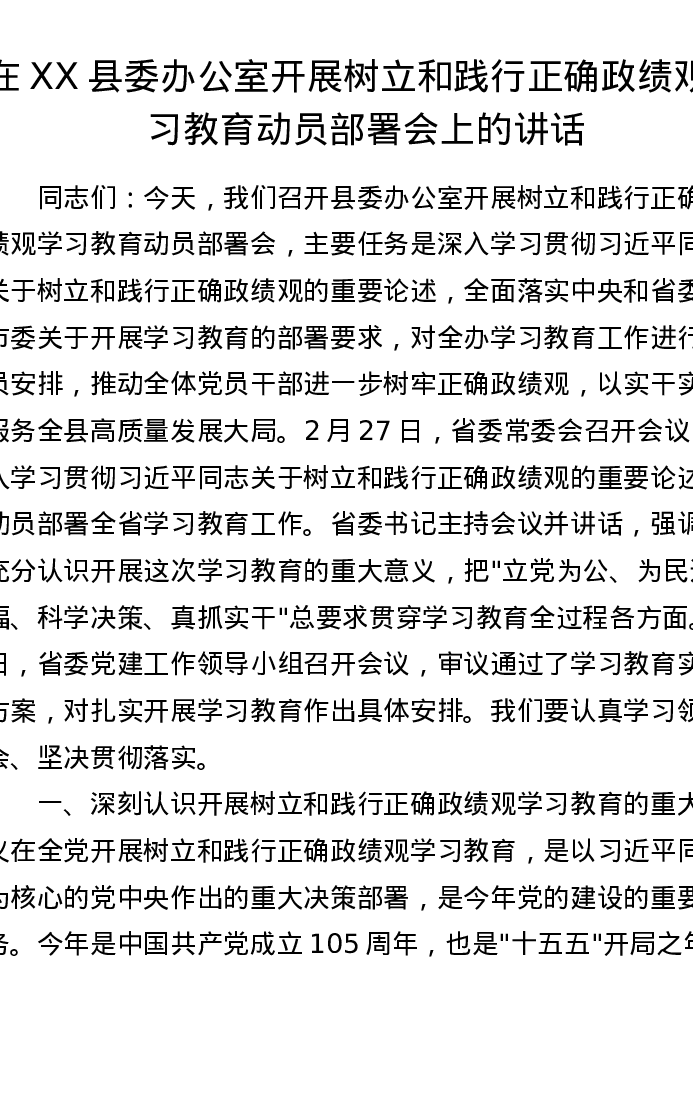 在XX县委办公室开展树立和践行正确政绩观学习教育动员部署会上的讲话