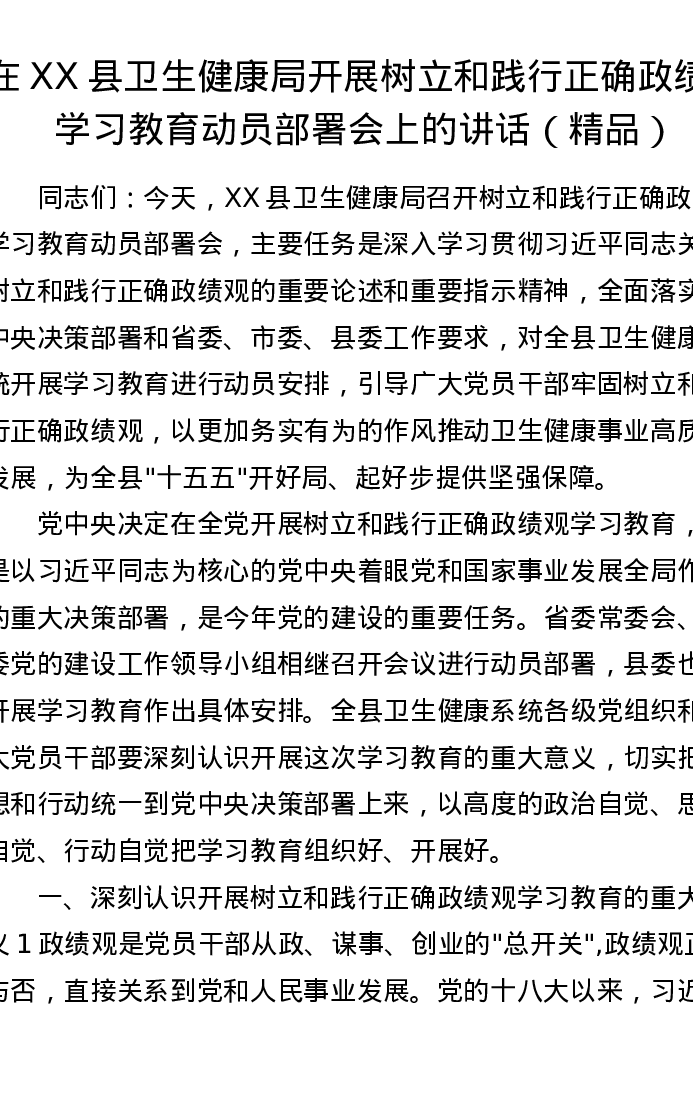 在XX县卫生健康局开展树立和践行正确政绩观学习教育动员部署会上的讲话