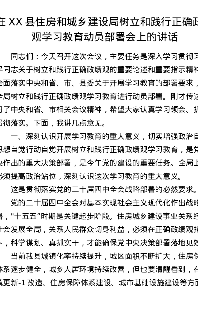 在XX县住房和城乡建设局树立和践行正确政绩观学习教育动员部署会上的讲话
