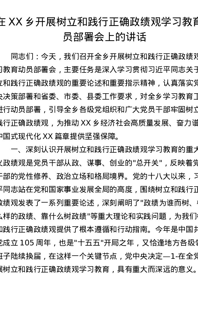 在XX乡开展树立和践行正确政绩观学习教育动员部署会上的讲话