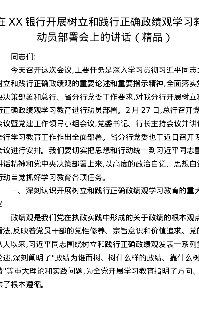 在XX银行开展树立和践行正确政绩观学习教育动员部署会上的讲话