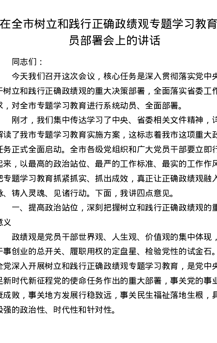 在全市树立和践行正确政绩观专题学习教育动员部署会上的讲话