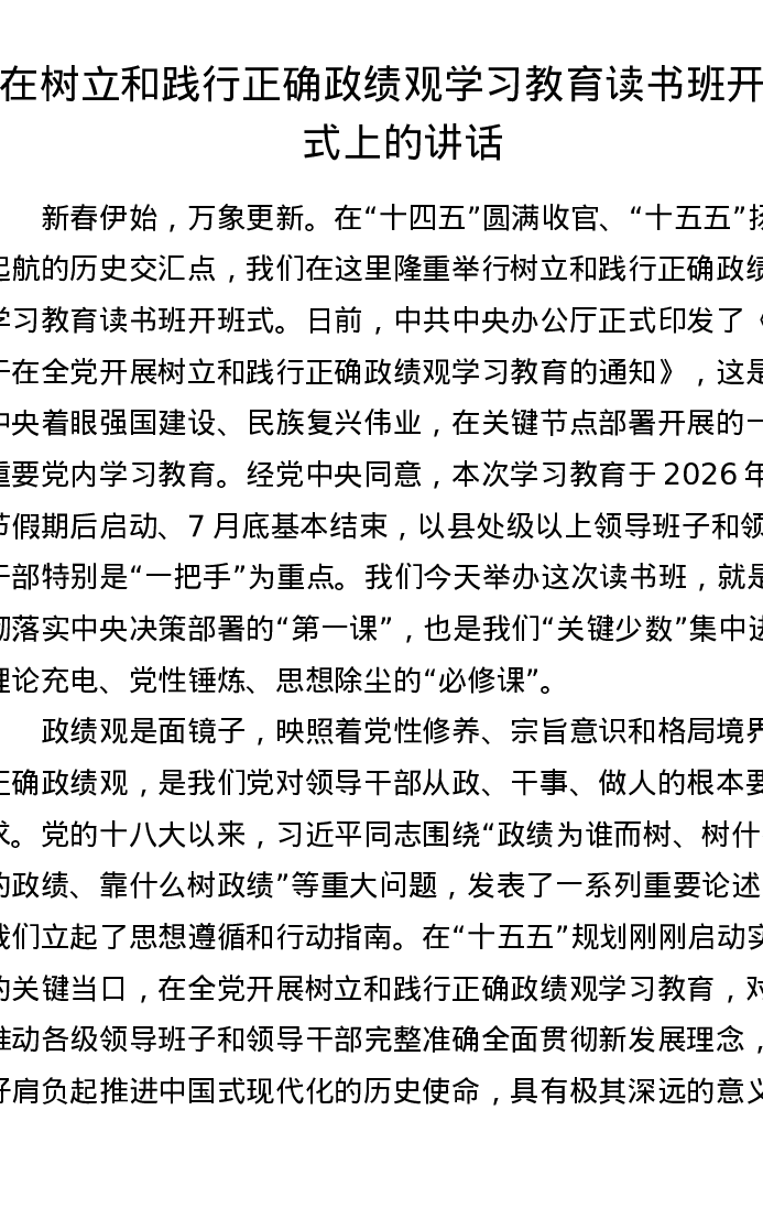 在树立和践行正确政绩观学习教育读书班开班式上的讲话