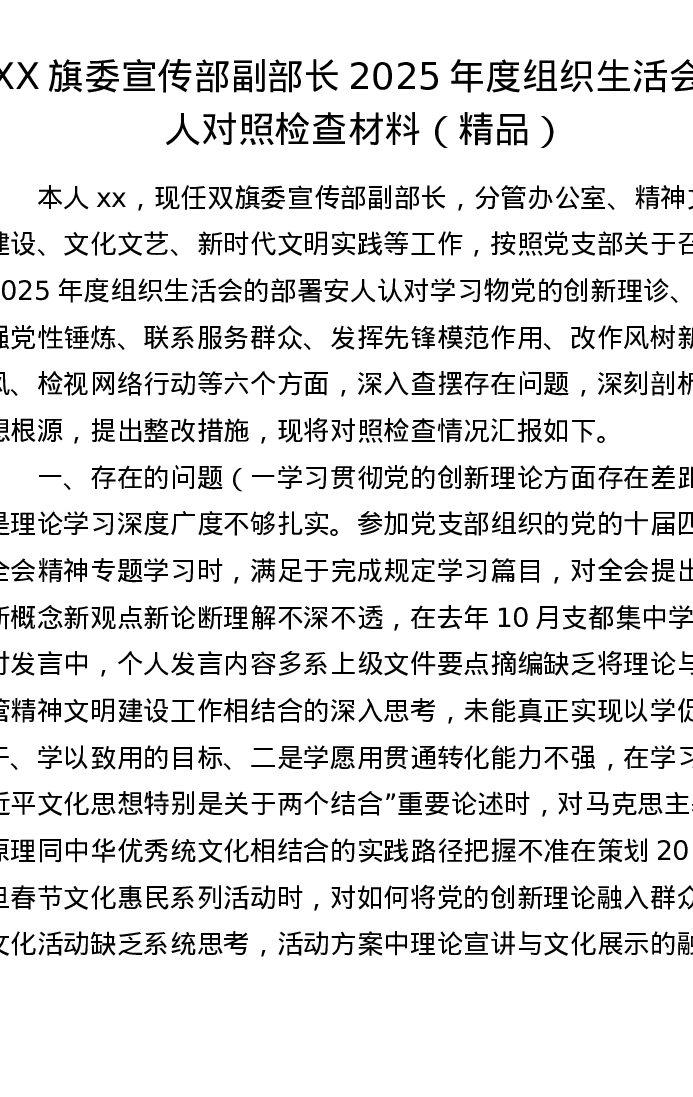 XX 旗委宣传部副部长 2025 年度组织xxx个人对照检查材料
