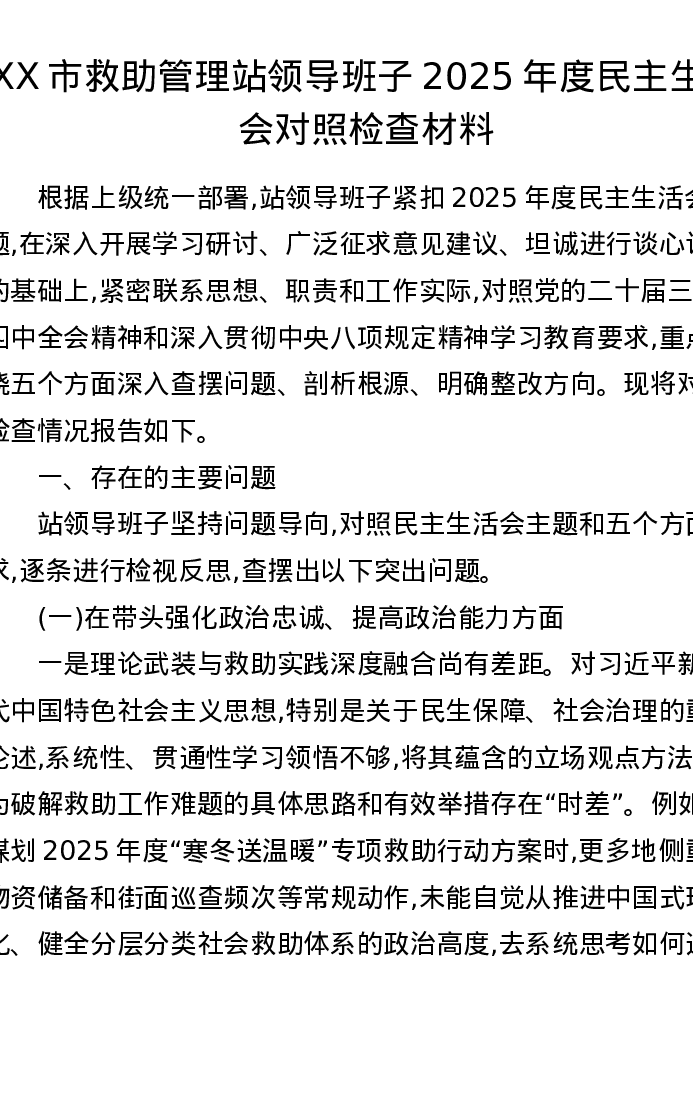 XX市救助管理站领导班子2025年度xxxxx对照检查材料
