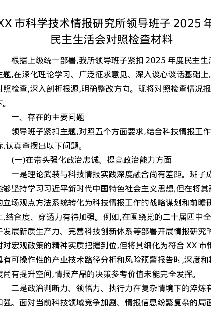 XX市科学技术情报研究所领导班子2025年度xxxxx对照检查材料