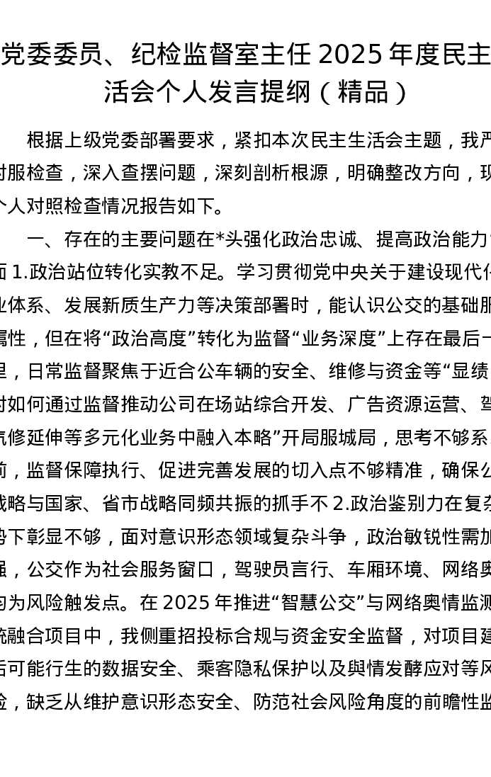 党委委员、纪检监督室主任2025年度xxxxx个人发言提纲