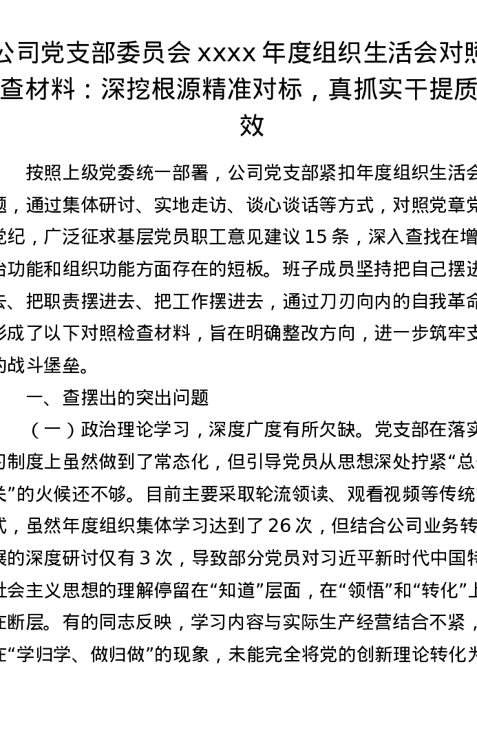 公司党支部委员会xxxx年度组织xxx对照检查材料:深挖根源精准对标,真抓实干提质增效