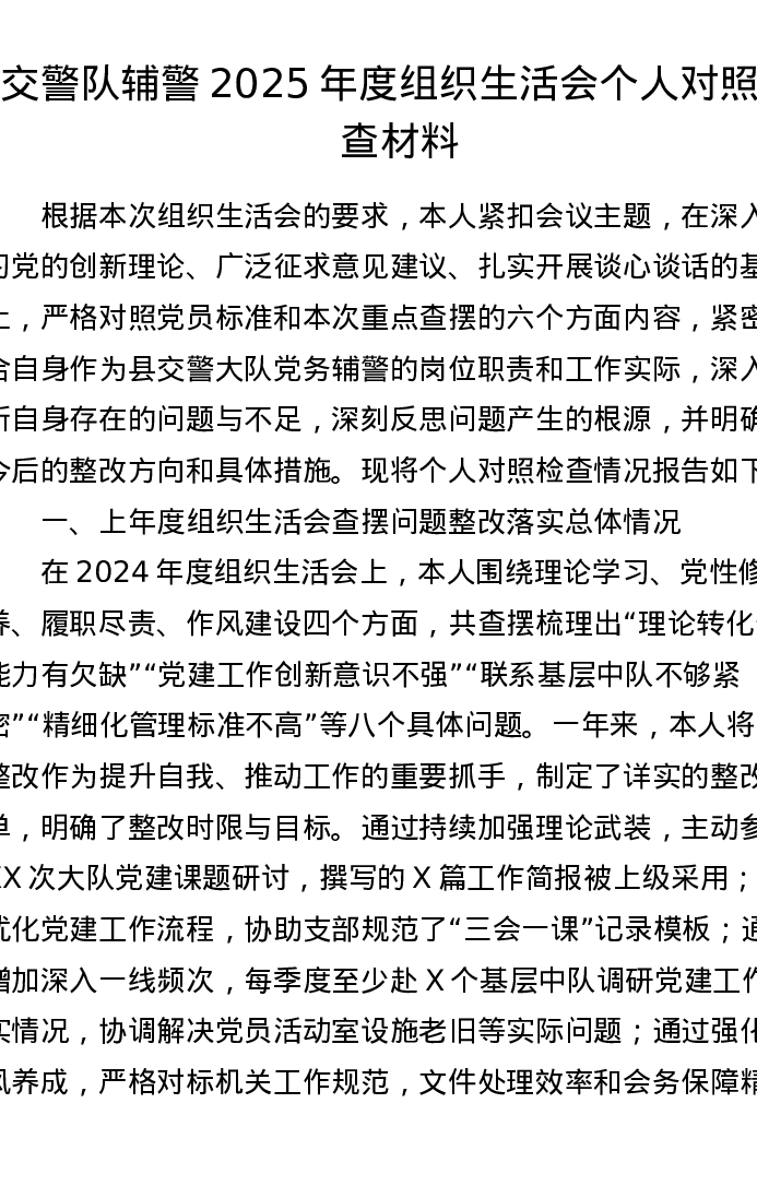 交警队辅警2025年度组织xxx个人对照检查材料