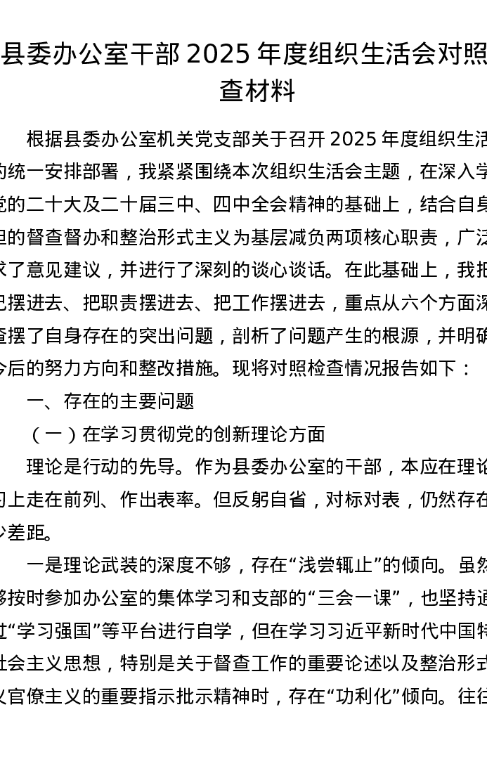 县委办公室干部2025年度组织xxx对照检查材料