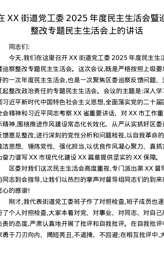 在XX街道党工委2025年度xxxxx暨巡察整改专题xxxxx上的讲话