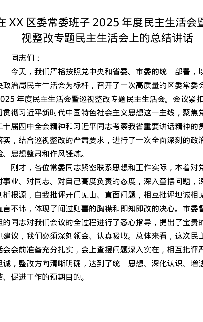 在XX区委常委班子2025年度xxxxx暨巡视整改专题xxxxx上的总结讲话