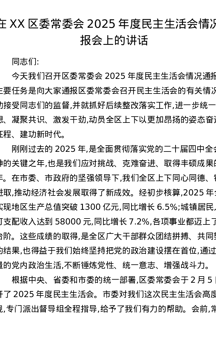 在XX区委常委会2025年度xxxxx情况通报会上的讲话