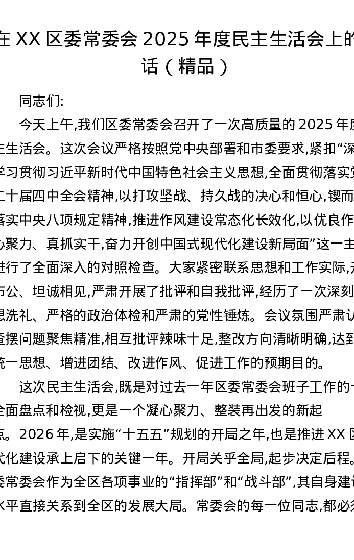 在XX区委常委会2025年度xxxxx上的讲话
