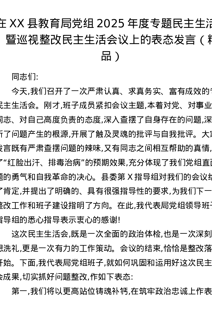 在XX县教育局党组2025年度专题xxxxx暨巡视整改xxxxx议上的表态发言