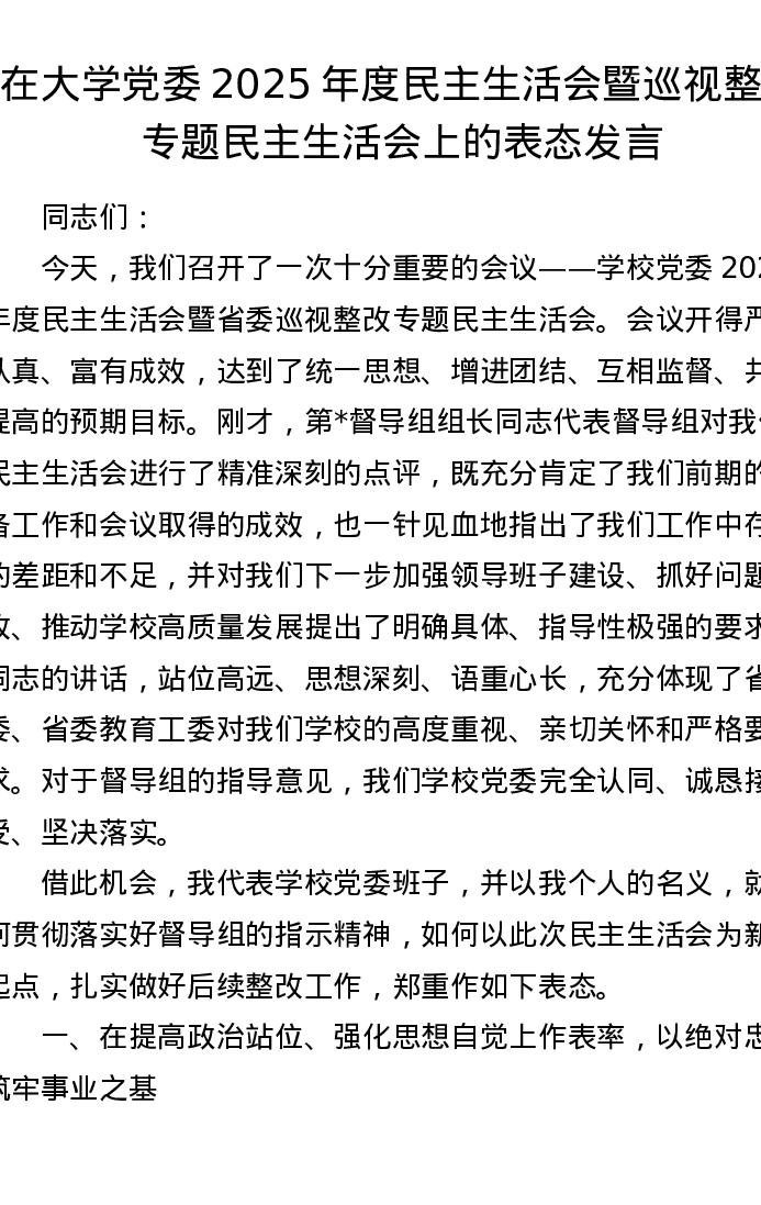 在大学党委2025年度xxxxx暨巡视整改专题xxxxx上的表态发言