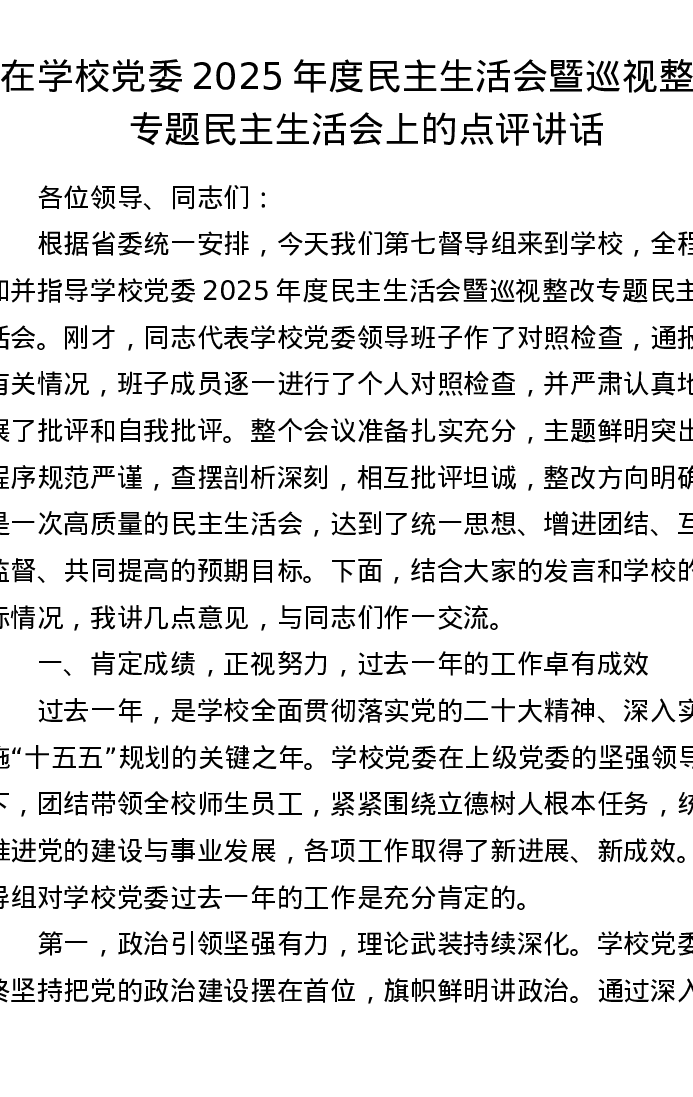 在学校党委2025年度xxxxx暨巡视整改专题xxxxx上的点评讲话