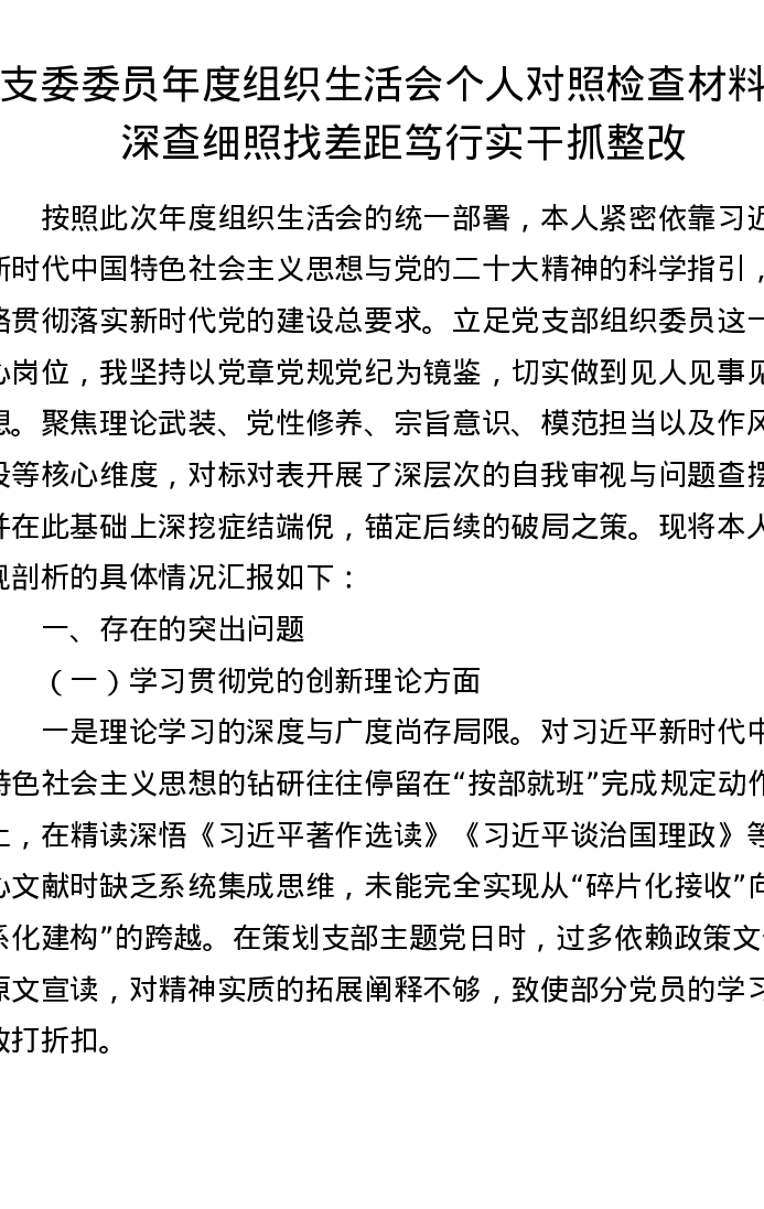 支委委员年度组织xxx个人对照检查材料:深查细照找差距 笃行实干抓整改