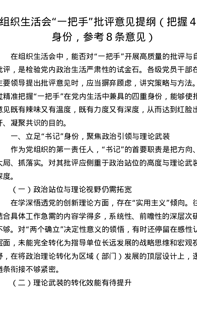 组织xxx一把手批评意见提纲 (把握4种身份,参考8条意见)