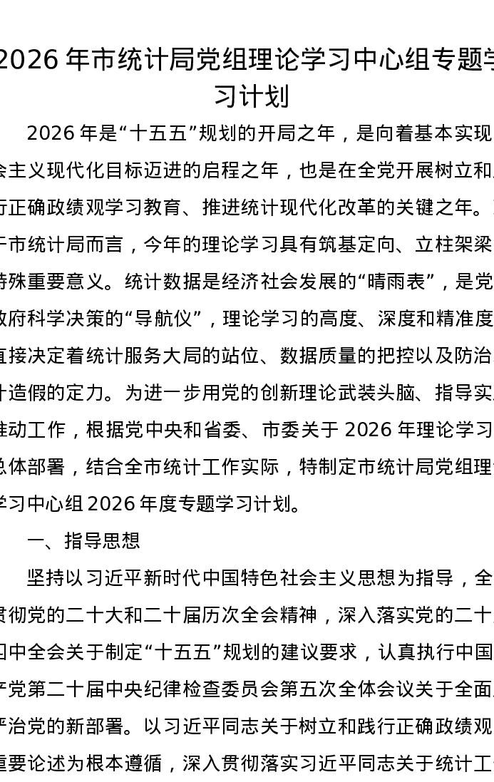 2026年市统计局党组理论学习中心组专题学习计划