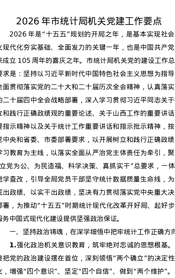2026年市统计局机关党建工作要点