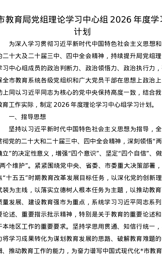 市教育局党组理论学习中心组2026年度学习计划