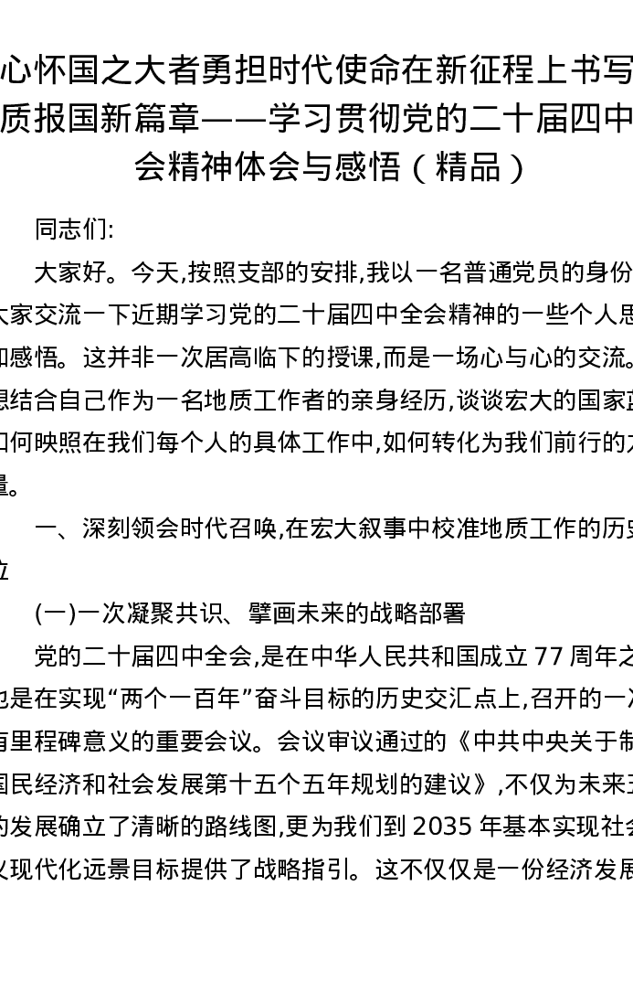心怀国之大者勇担时代使命在新征程上书写地质报国新篇章——学习贯彻党的二十届四中全会精神体会与感悟