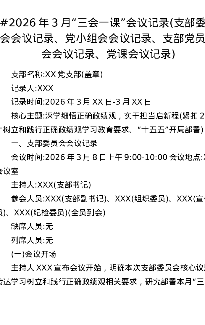 2026年3月三会一课会议记录(支部委员会会议记录、党小组会会议记录、支部党员大会会议记录、党课会议记录)