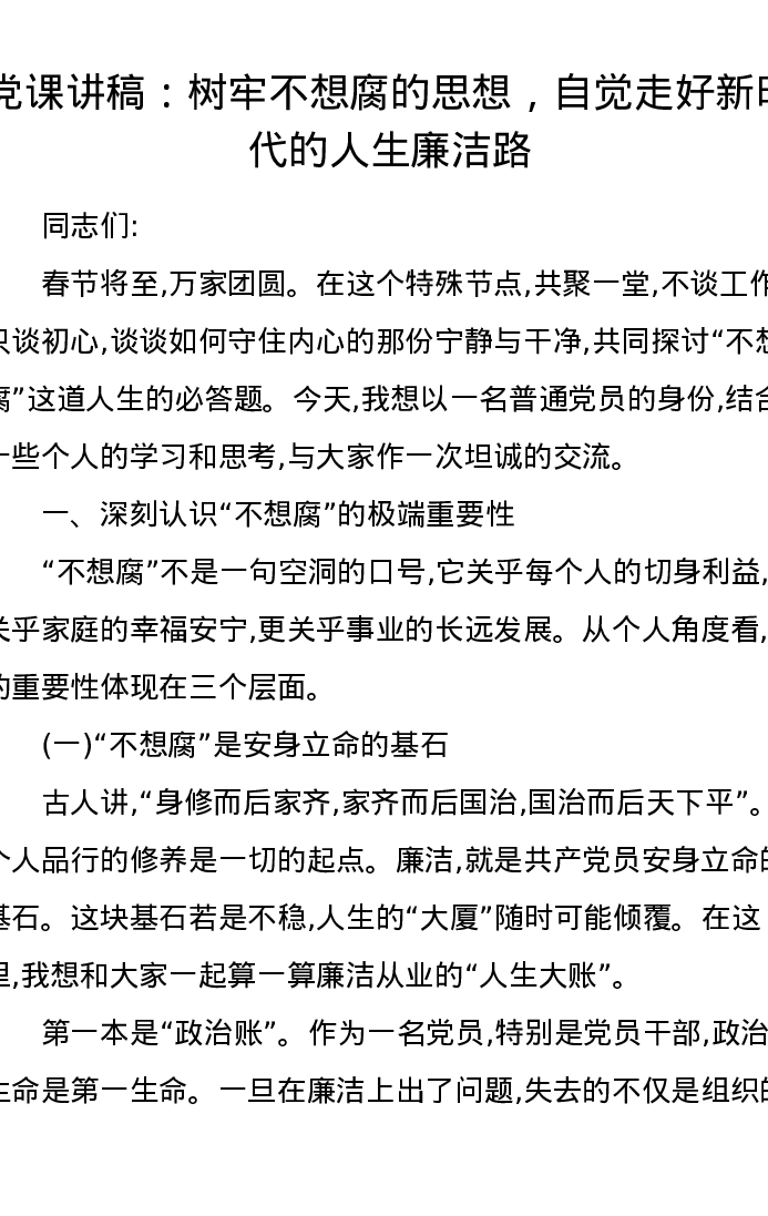 党课讲稿:树牢不想腐的思想,自觉走好新时代的人生廉洁路
