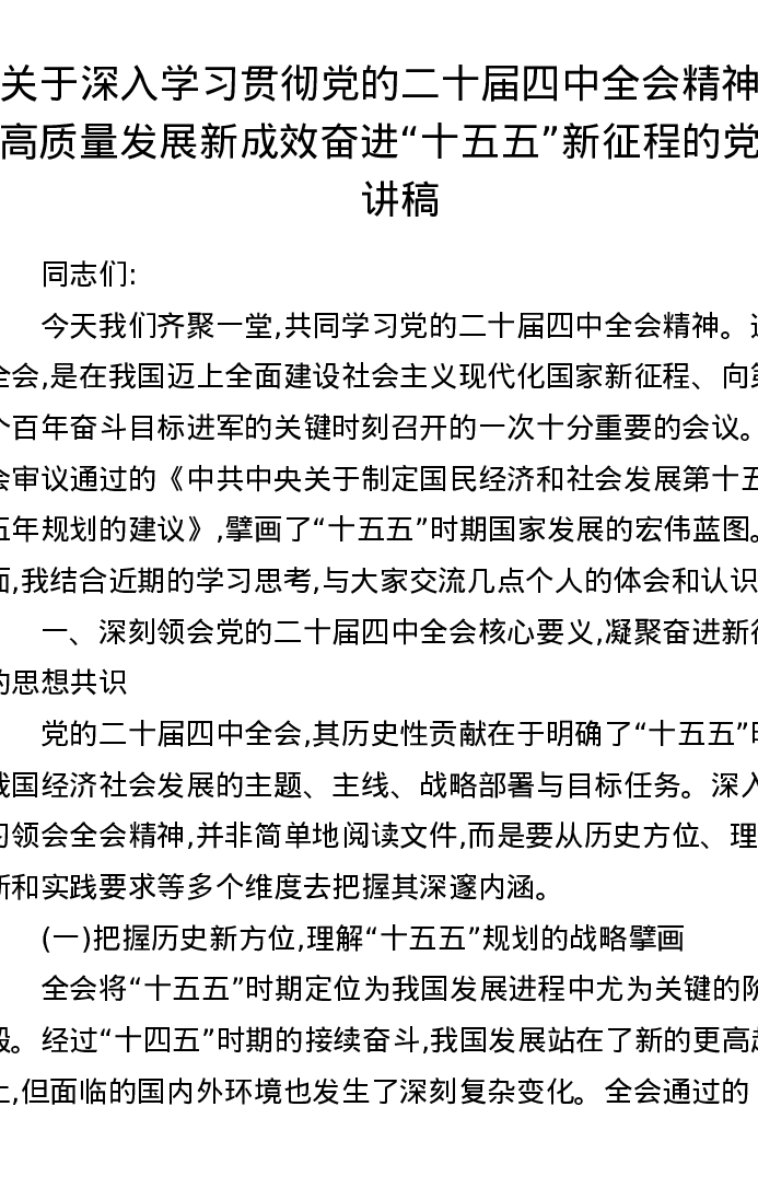 关于深入学习贯彻党的二十届四中全会精神以高质量发展新成效奋进十五五新征程的党课讲稿