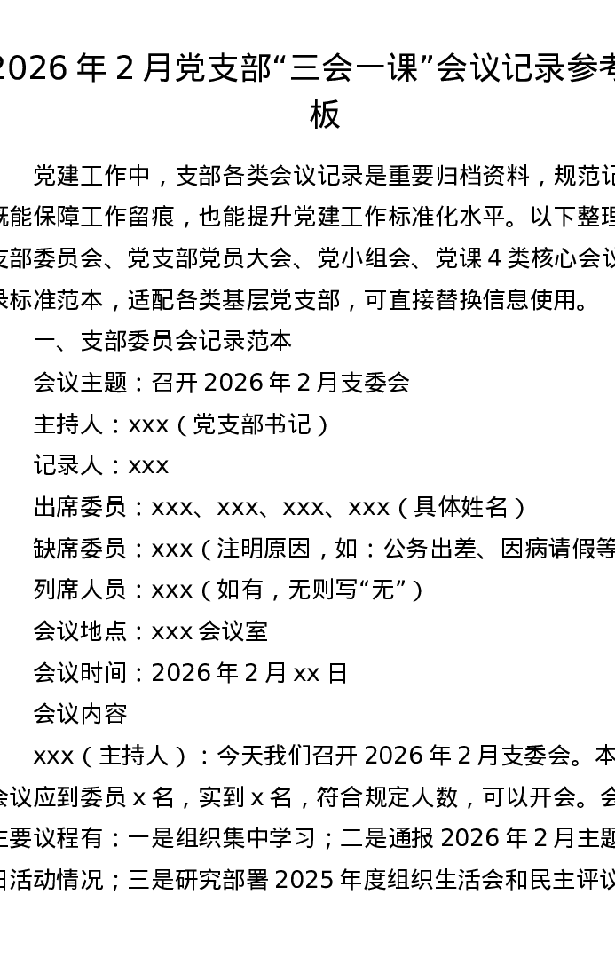 2026年2月党支部三会一课会议记录参考模板