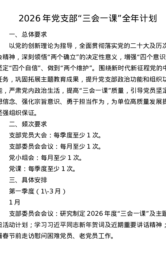 2026年党支部三会一课全年计划