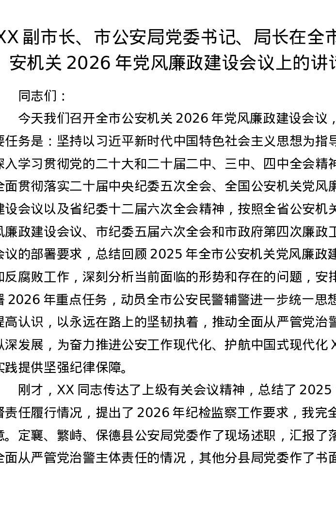 XX副市长、市公安局党委书记、局长在全市公安机关2026年党风廉政建设会议上的讲话3