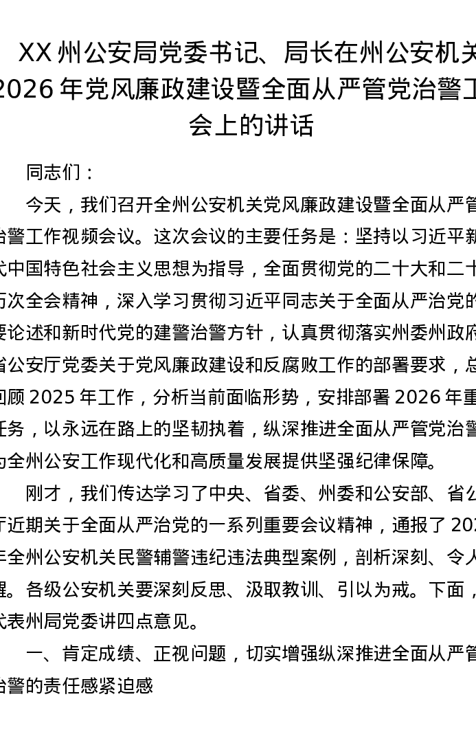 XX州公安局党委书记、局长在州公安机关2026年党风廉政建设暨全面从严管党治警工作会上的讲话