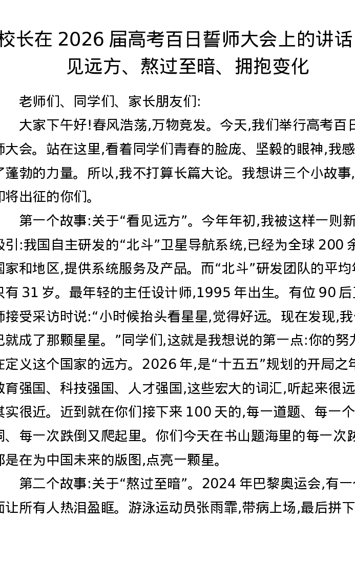 校长在2026届高考百日誓师大会上的讲话:看见远方、熬过至暗、拥抱变化
